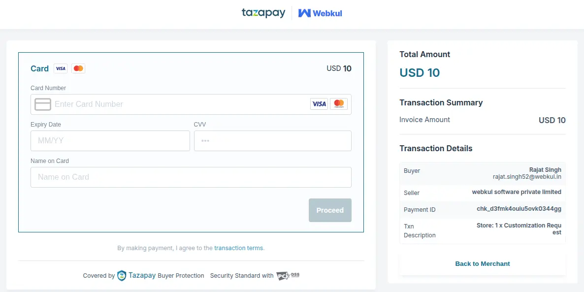 At the checkout time, select the payment method as International Credit/Debit Card (Tazapay Payment Gateway). After that, you will be redirected to the Tazapay payment gateway page.